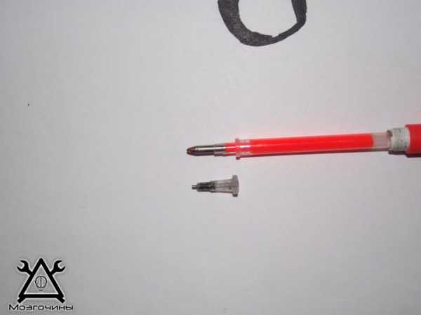 1. Вынуть стержень из ручки, вытащить металлический кончик стержня и отмыть как можно более чисто стержень от содержащейся в нем пасты.