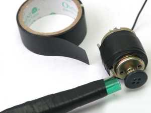 - Чтобы к трубке прикрепить моторчик, необходимо взять от ручки металлический держатель и примотать к моторчику скетчем. Раскаленной иголкой под размер струны в валике моторчика сделайте небольшое отверстие (только делайте не по центру).