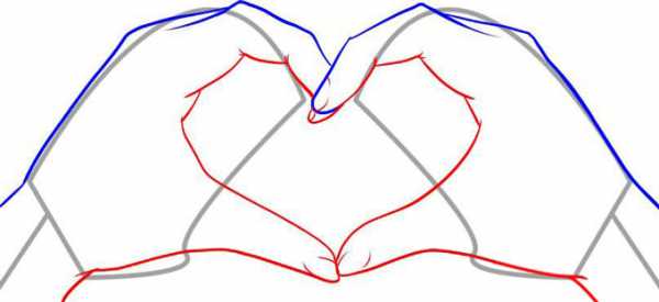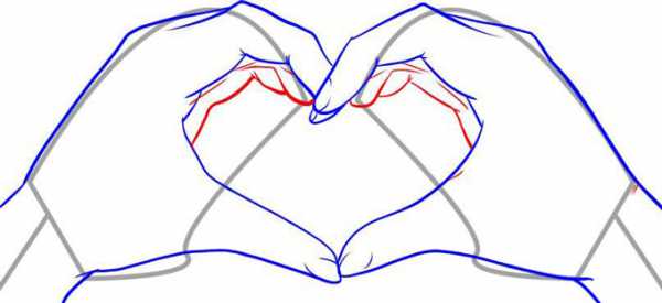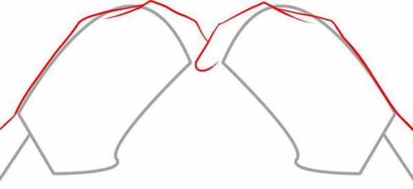 Теперь нарисуем указательные пальцы, касающиеся друг друга. Все нужные линии для прорисовки на данном этапе, отмечены красным цветом.