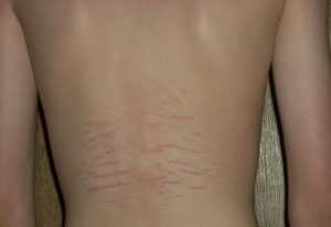 Шрамы на спине в виде полосок, особый вид рубцовых изменений кожи, который возникает без повреждения кожи – стрии, или так называемые растяжки. Они имеют вид множественных, горизонтально расположенных параллельных полос, отличающихся от нормальной кожи по цвету. Вначале появления они имеют розовый или красный цвет, спустя 1-1,5 месяца приобретают синий или фиолетовый оттенок, а затем постепенно бледнеют.