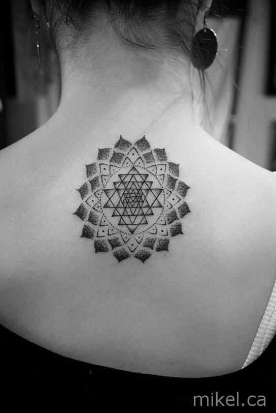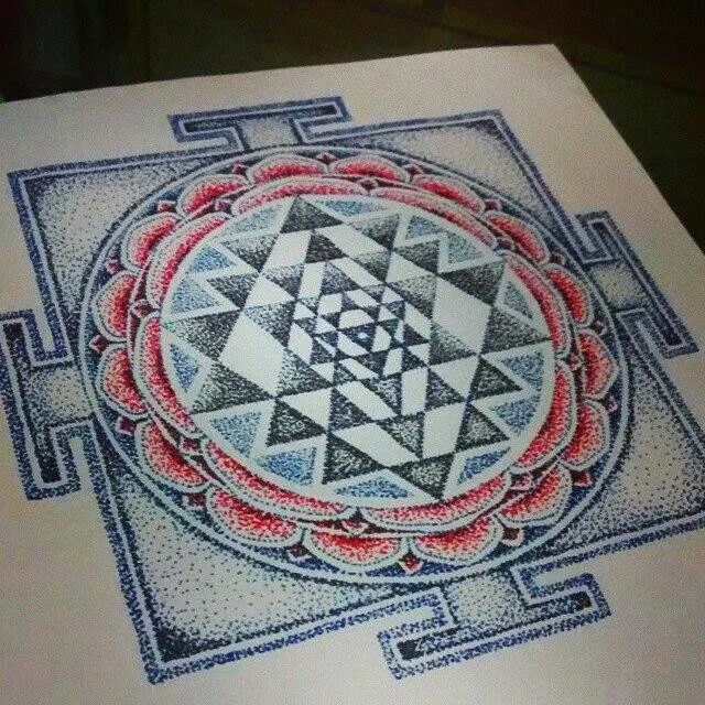 е. мистической диаграммой, используемой для прихода к пониманию сути бытия. По сути, это ключ к разгадке самых загадочных тайн жизни. Это абстрактное геометрическое представление вселенной похоже на атлас, представляющий то, что школа тантры Шри Видья — религиозная система, посвященная богине Трипура Сундари — считает основными элементами космоса. Учитывая глубокие духовные свойства рисунка и завораживающий внешний вид, неудивительно, что он стал таким популярным в татуировках блэкворк.