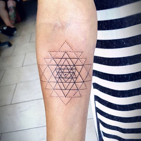 Шри Янтра состоит из девяти переплетенных треугольников, которые создают последующий набор параллелограммов, ромбов и 43 других треугольников. Если вы внимательно посмотрите на эти татуировки, вы сможете четко разглядеть, как сочетается дизайн. В центре этой геометрической последовательности находится бинду (то же самое слово для религиозной точки, применяемое к лбу людей в индуизме). Из-за своей отчетливой 14-конечной формы звезды Шри Янтра выделяется среди бесчисленного множества других янтр, которые, как правило, имеют менее сложные формы.