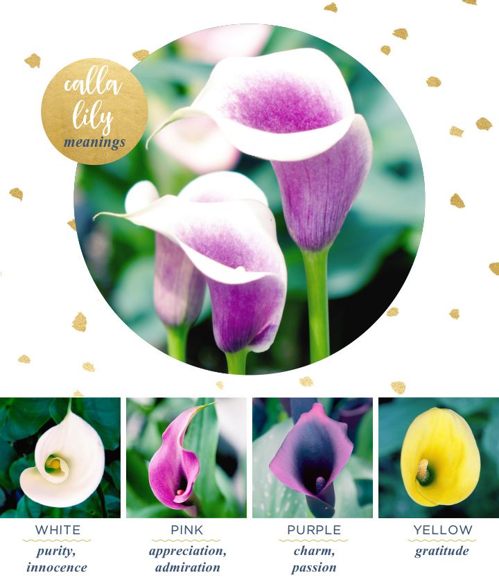 Сейчас язык цветов вновь набирает популярность. Поскольку каллы бывают не только белые, но и разнообразных цветов, каждый цвет несет иной смысл. Поэтому букет из одних и тех же цветов может нести различную смысловую нагрузку. В то время как белый, естественно, будет говорить о чистоте и невинности, розовый расскажет о восхищении и признательности. Фиолетовый, который часто ассоциируется с королевским цветом, обозначает страсть. Желтые каллы могут нести множество смыслов, но, как правило, все они связаны с благодарностью. Черные каллы, яркие и драматические внешне, несут значение элегантности и таинственности.