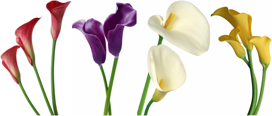 Селекционеры вывели 28 разновидностей калл, среди которых есть растения с желтыми, красными, бордовыми, пурпурными и даже лиловыми цветками, оттенок которых может быть почти черным. Есть гибридные сорта, сочетающие сразу несколько окрасок.