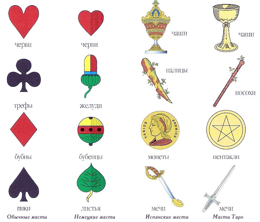 Однако в прошлом в качестве мастей часто употреблялись кубки, мечи, палицы и монеты.