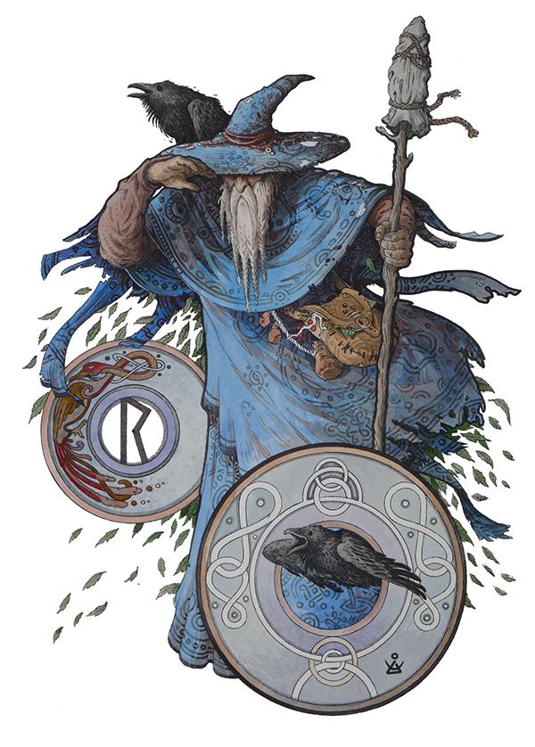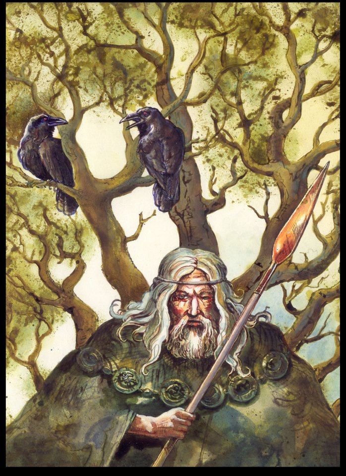 Он странствует по свету, скрывая свой истинный облик, — чтобы видеть мир таким, каким видят его люди. Он ходит меж нас под видом высокого мужа в плаще и шляпе. И есть у него два ворона, которых он зовет Хугин и Мунин, что значит «мысль» и «память». Птицы эти летают по миру, разузнавая новости, и приносят их Одину. Они садятся своему хозяину на плечи и нашептывают ему в уши все, о чем узнали. Восседая на своем высоком престоле, который носит имя Хлидскьяльв, Один видит все, что происходит на свете.