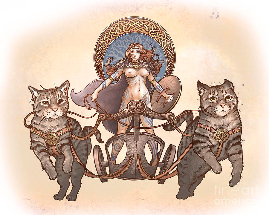 Фрейя ищет своего мужа Одура в колеснице, запряженной двумя белыми кошками. Когда она ехала, она плакала золотом…