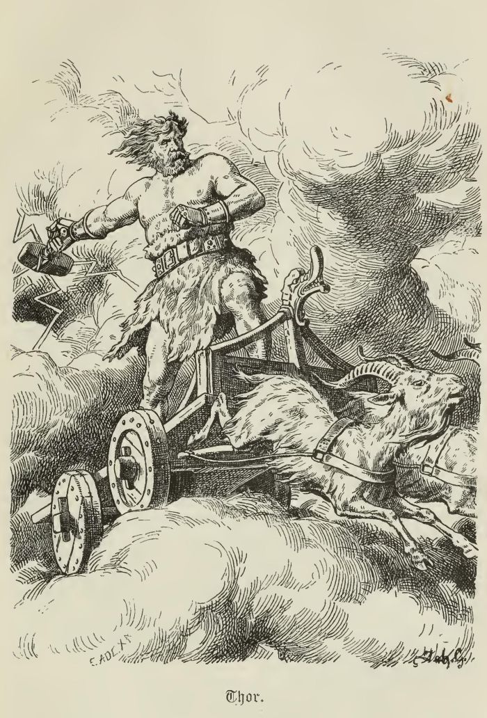 Скандинавский бог грома, Тор едет на своей медной колеснице, запряженной его козами, Зуборезом и Зуборезом.…