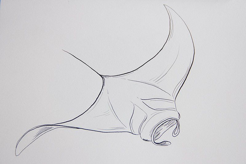 Шаг 5. Завершение тела ската Рисование ската, шаг 5 На этом пятом этапе создания рисунка ската вам нужно будет нарисовать последние штрихи для тела ската. Из доступных штрихов вы добавляете изогнутую линию вокруг него, чтобы сформировать остальную часть тела.