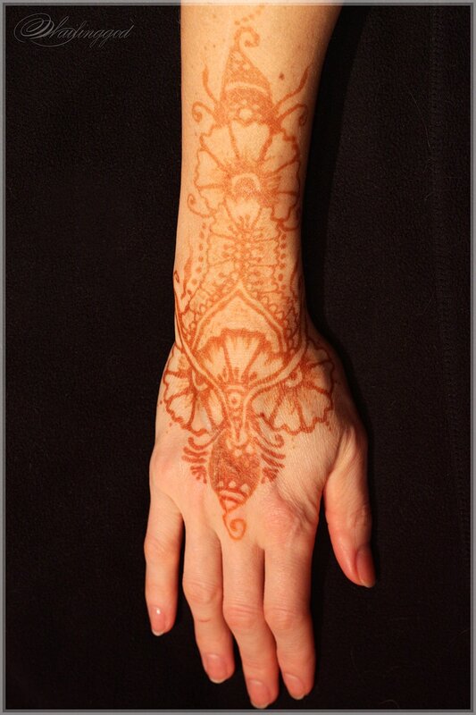Складки на запястье создают несколько проблем – запястье трудно удерживать неподвижным, а линии также поглощают цвет больше, чем тыльная сторона ладони. Костяшки также больше окрашиваются, а хна имеет тенденцию кровоточить на суставах.