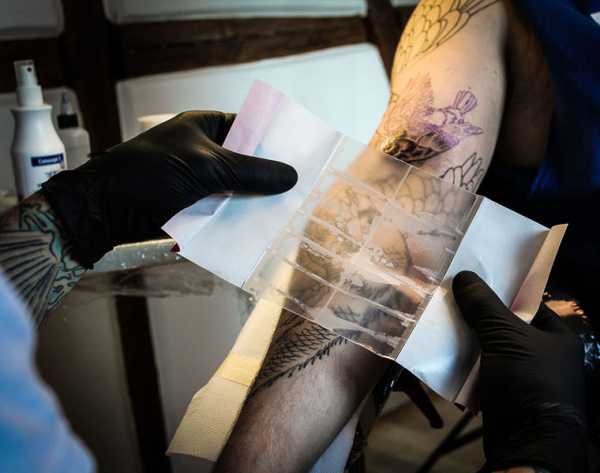 После того, как мастер нанес изображение на тело, он протирает поверхность кожи антибактериальным средством и накладывает компресс в виде пленки. Она предотвращает попадание инфекции на рану и способствует быстрому заживлению. Компресс накладывается один раз в салоне и снимается через 3-4 часа. Делать примочки, заматывать татуировку в последующем нельзя.