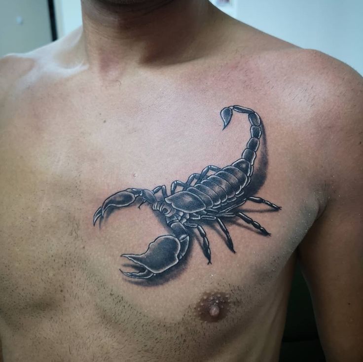 - Грудь: сундук — еще одно популярное место для татуировок, и он может быть хорошим выбором для больших рисунков. Тату скорпиона, размещенный на груди, при желании можно легко прикрыть одеждой.