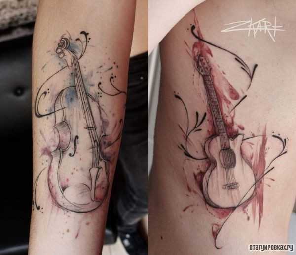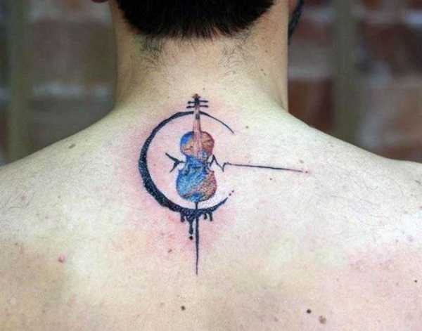 Многие люди предпочитают наносить на тело изображения каких-либо музыкальных инструментов. Как правило, такой человек может являться композитором, музыкантом, певцом или обычным слушателем. Поскольку скрипичные струны сравнивают с ниточками человеческой души, то изображение этого инструмента на мужском теле может символизировать утонченную ранимую душу, скрывающуюся за внешней суровостью.