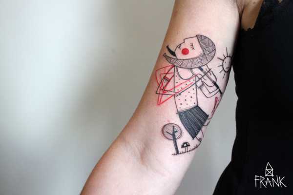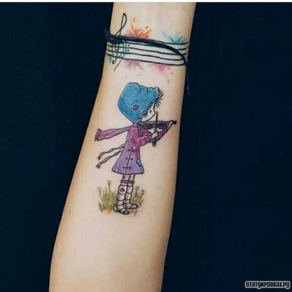 Музыканты предпочитают добавлять в эскиз ноты или аккорды из песен. Трогательно и мило выглядят немного детские рисунки с человечком, играющим на скрипке. Тату указывает на некоторую инфантильность и ностальгию по беззаботным временам.