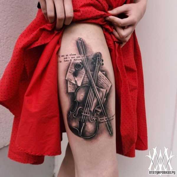 Скрипка по своим очертаниям напоминает женское тело, такое тату подойдет всем творческим девушкам, даже, если они не имеют отношение к музыкальной деятельности или играют на другом инструменте.