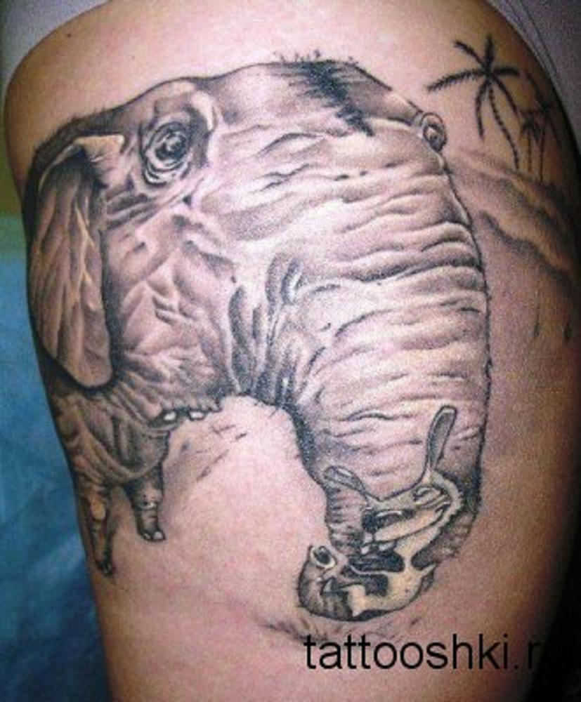 Татуировка серого слона на бедре