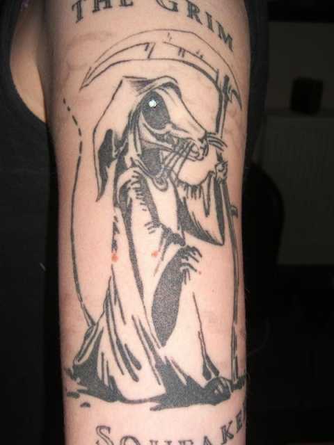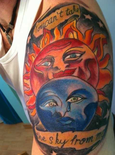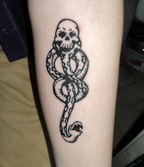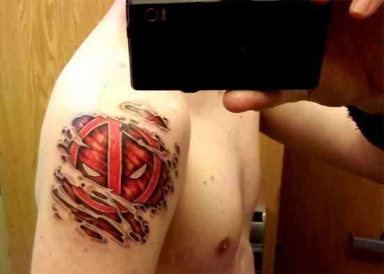 Тату эффектно выглядит в среднем размере, поэтому нанесено на плечо. Яркое изображение в стиле нью скул привлекает внимание. Присмотревшись, сложно скрыть улыбку от вида Гомера, попивающего Duff. Внизу – недовольный змей-искуситель, которого прижали к земле. Тату словно говорит: «Сначала пиво, и пусть все грехи подождут».
