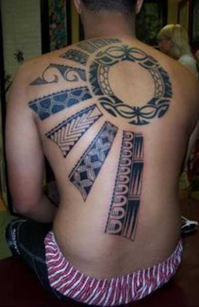 Мужчины часто делают тату солнца в племенном стиле на плечах. Или же на спине или груди, делая солнце частью большой конструкции.