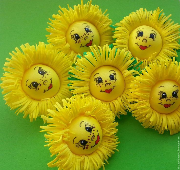 Глазки рисуют фломастерами или вырезают фрагменты из цветной бумаги и наклеивают их на «лицо». Как уже говорилось, с одной стороны они открытые. Чтобы выражение глаз казалось выразительным, украшают их объёмными ресничками, вырезанными из чёрной бумаги. Для этого кончики накручивают на карандаш, а к «веку» крепят только тонкую полоску. С другой стороны реснички садят на прикрытое веко. Рисуют улыбку, добавляют солнышку румянец, веснушки.