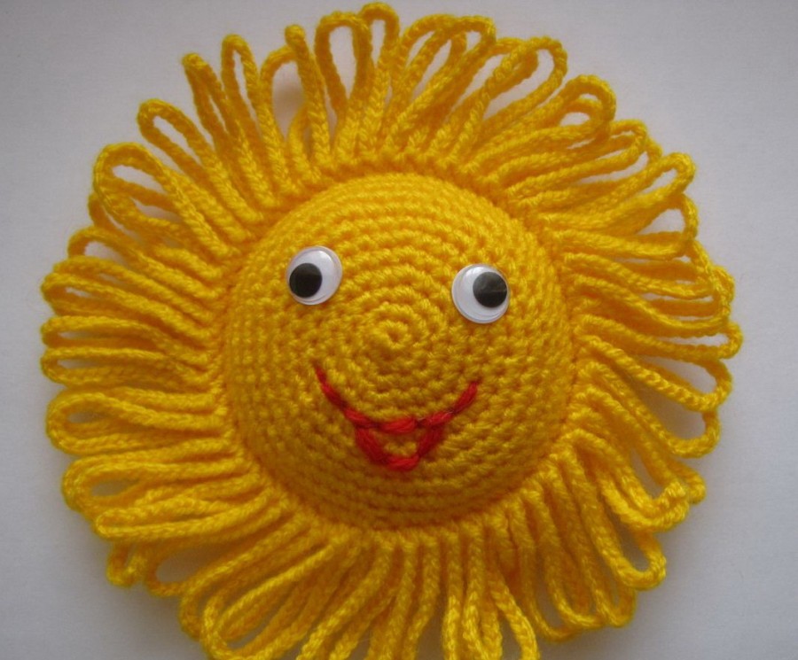 Солнце на лозе с лучами-косичками из пряжи.