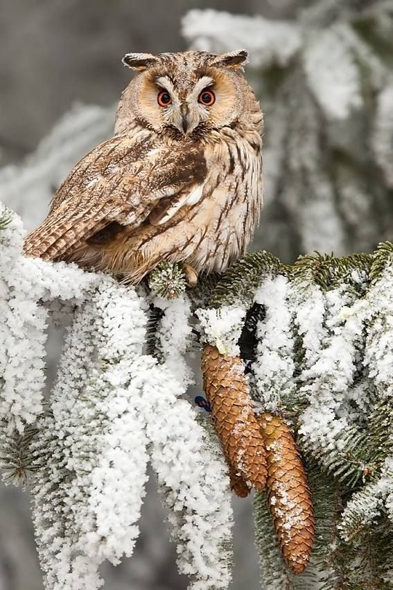 Große Horneule im verschneiten Zweig в Скалистых горах Колорадо в Westen der USA.