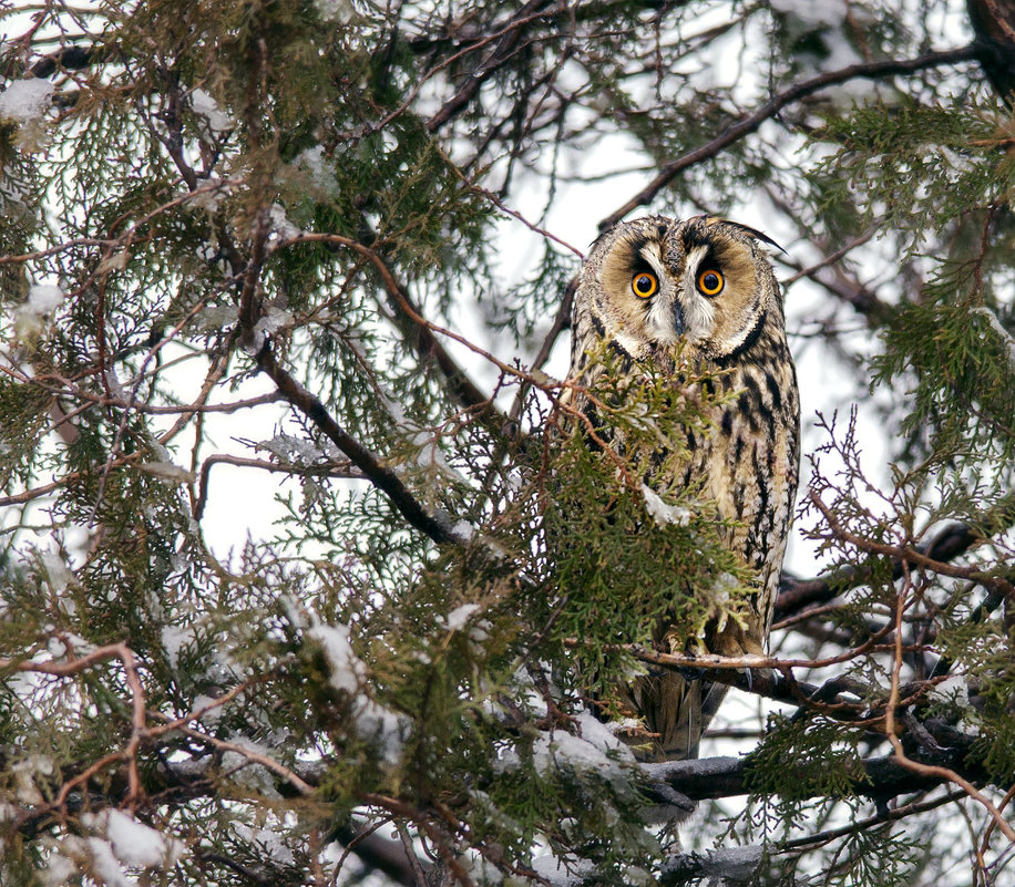 Сова с желтыми глазами сидит на ветвиПтицы