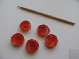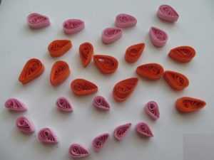 - Большинство заготовок будут «каплями». Для их создания накрутите свободную завитушку и закрепите финальную точку. Аккуратно выньте стержень и зажмите пальцами один край ролла, чтобы он вытянулся, принимая необходимый вид.