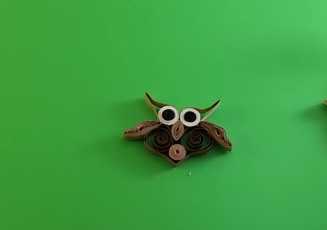 Для крылышек совы используем светло-коричневую полосу, сворачиваем её, немного распускаем, и кончики прогибаем в противоположные от друг друга стороны.