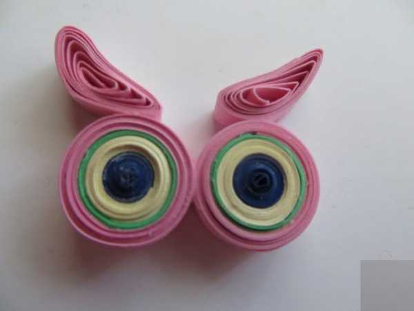 Для этого мы берём короткий отрезочек, промазываем два кончика клеем и приклеиваем их к глазу с двух сторон. Ждём, пока ушки немного присохнут, и сгибаем их пополам.
