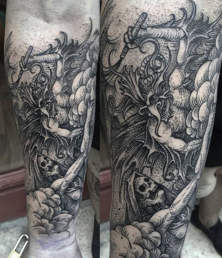 Не сказать, что работа в стиле «Гравюра» легкая, как минимум необходим действительно профессиональный мастер с соответствующим оборудованием. Косяки, в виде кривых линий нельзя будет исправить, они просто испортят всю татуировку. А новичок без опыта, пусть даже с прямыми штрихами и вовсе рискует запороть всю работу пробив кожу на миллиметр глубже. В этом случае, игла выйдет за слой «дерма» и татуировка просто «расплывется» по бокам линий штрихов синими пятнами.
