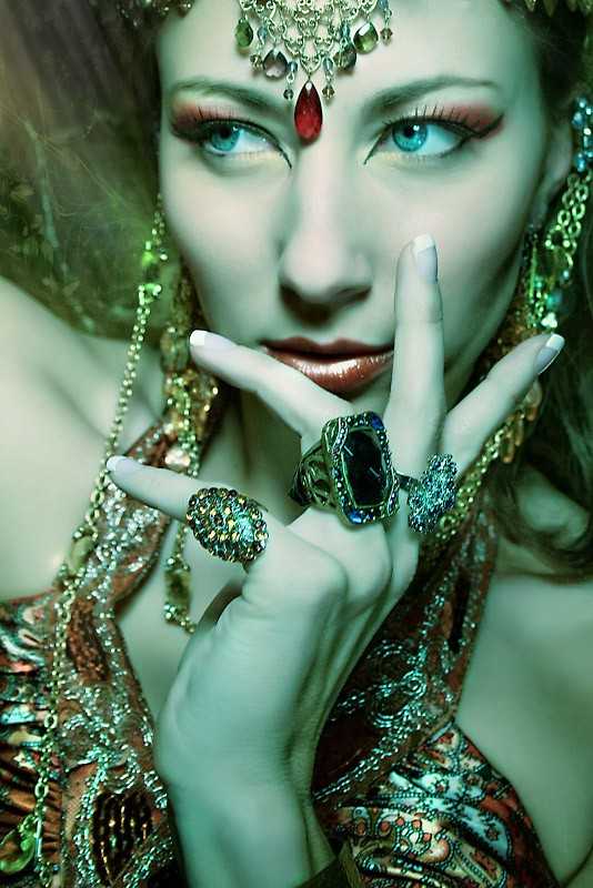 Обилие массивных украшений на руках, шее и голове;