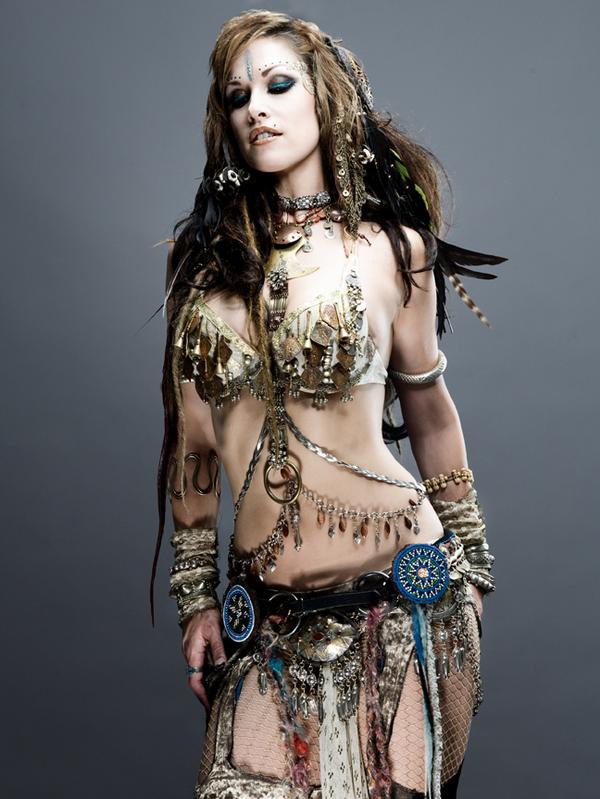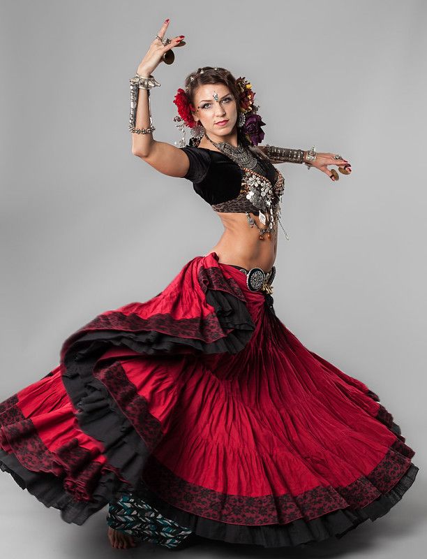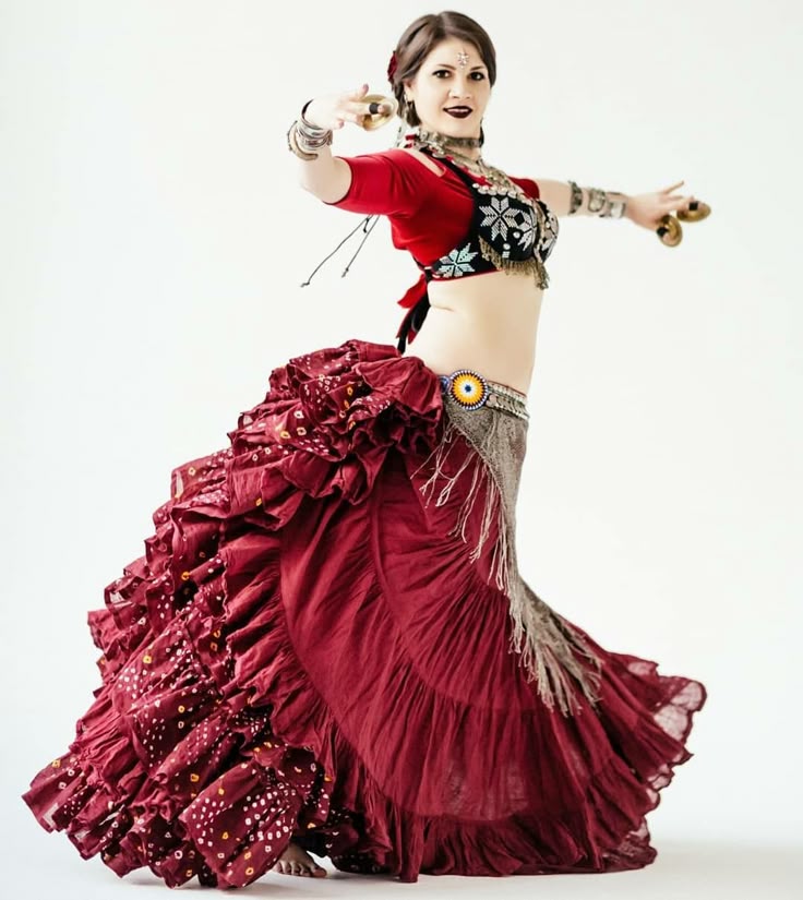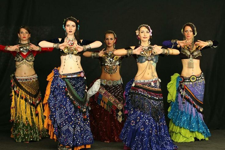 Американские племенные танцовщицы живота обычно носят длинные многослойные юбки в цыганском стиле, короткие чоли, бюстгальтер, украшенный монетами, набедренные шарфы с бахромой, тяжелые серебряные украшения и тюрбаны.