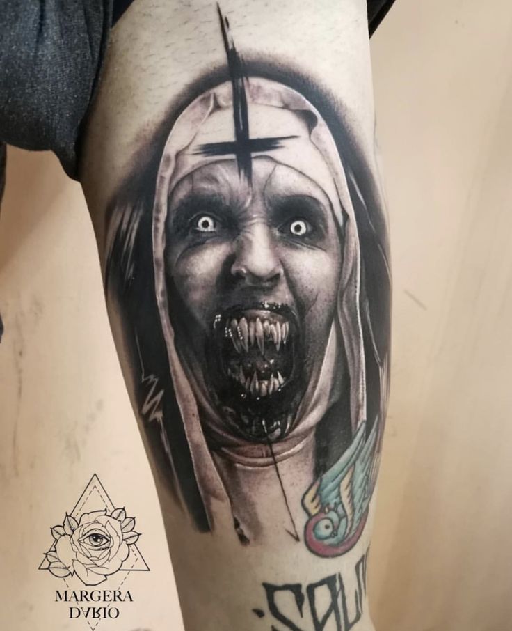 Сочетание черно-белых и цветных татуировок создает идеальный дизайн лоскутной татуировки. Это причудливая идея страшных татуировок, и каждый может прочитать эту концепцию тьмы, раскрытую через различные фрагменты ужасов.