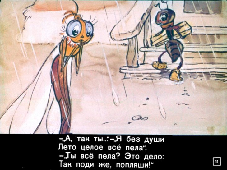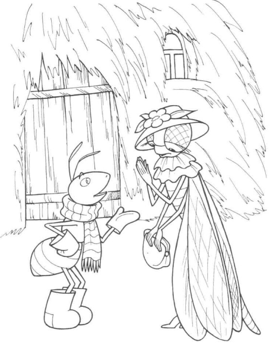И наша героиня идет к муравью просить убежища. Муравей стал расспрашивать, что непрошеная гостья делает летом, на что та просто рассказала, как резвилась летом и пела в траве. Где бы она могла работать и готовиться к зиме….