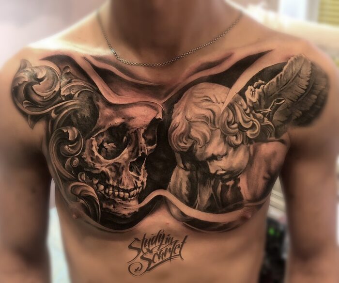 Вся правая сторона его лица покрыта татуировкой черепа с зияющими глазницами, почерневшим носом и идеально прорисованными костями и зубами. Он даже покрасил свое правое глазное яблоко в черный цвет для эффекта пустоты!