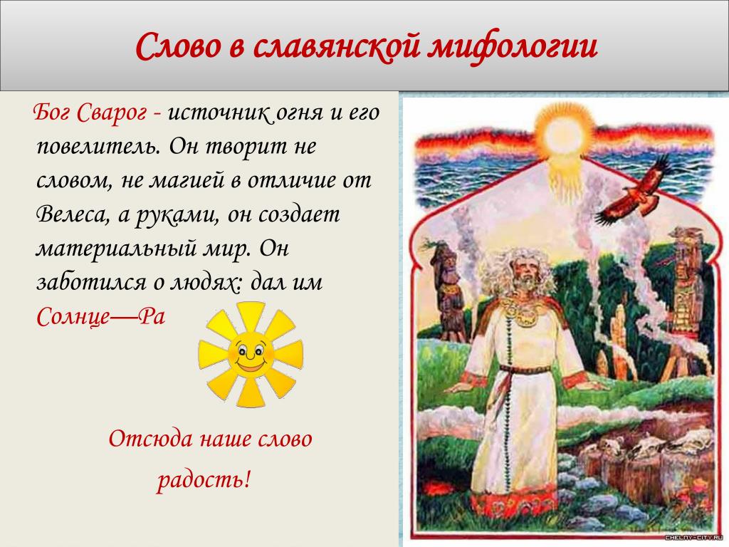 Славянский бог Сварог почитался самым верховным Богом, Богом, управляющим человеческими жизнями и мировым устройством. Бог славян Сварог работает, чтобы жить, и живет, чтобы работать. Он работает везде, работает всегда. Создает различные предметы и тут же берется за новые.