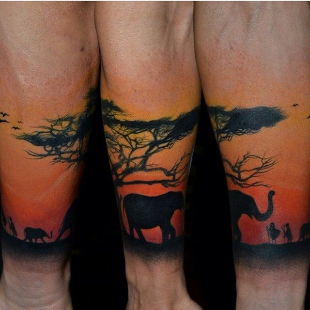 Еще один замечательный способ отдать дань уважения своим корням — сделать татуировку с изображением невероятного и захватывающего дух африканского пейзажа. Чаще всего такие татуировки изображают типичную африканскую природу, такую как дерево акации, невероятный закат, цвета, такие как желтый, красный и зеленый, африканские животные и т. Д. Эти татуировки лучше всего выглядят, когда они выполнены в стиле акварельной татуировки; цвета просто оживают и максимально напоминают африканскую природу.