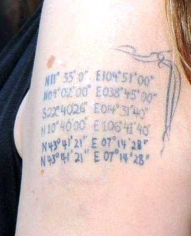 Анджелина всегда была прекрасной матерью, и все ее татуировки имеют глубокий смысл, связанный с ее сильными воспоминаниями или ее детьми. Ее левый бицепс имеет шесть географических координат долготы и широты, где она впервые встретила своих детей. Это:
