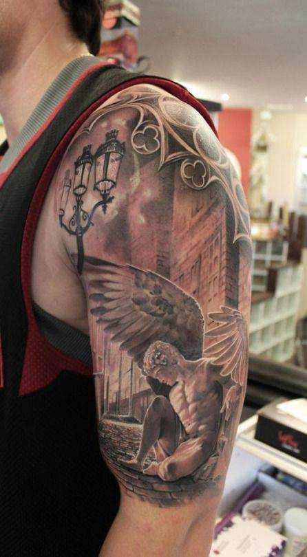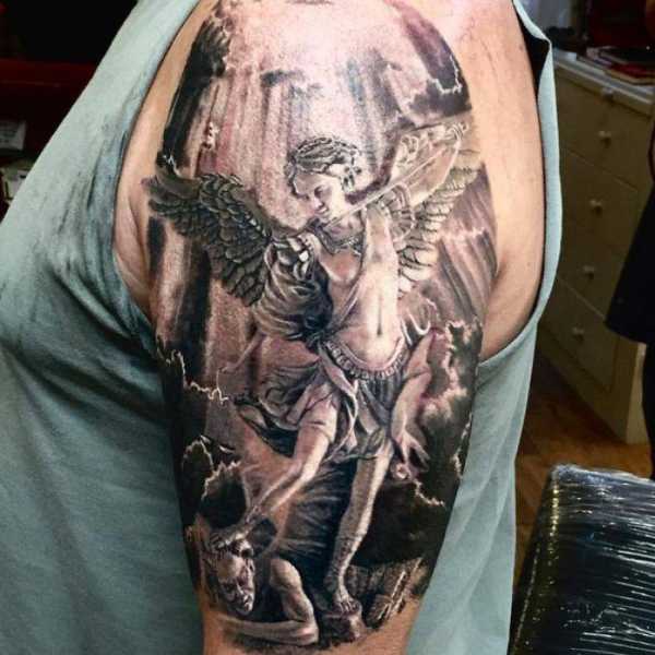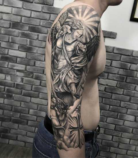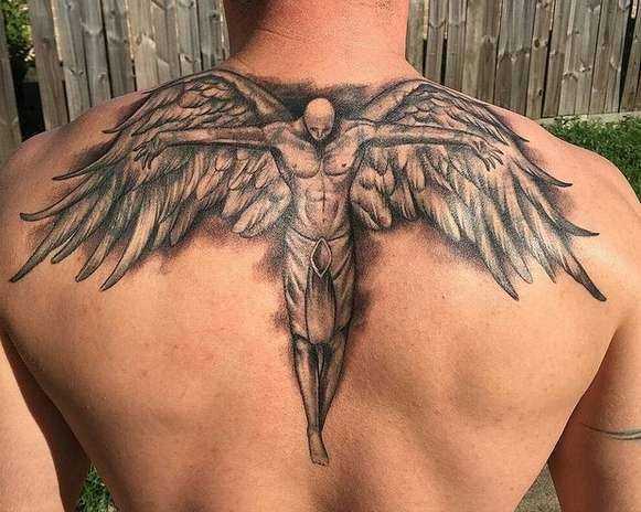 Мужчина показывает ангела в виде воина. На спине может быть изображено противопоставление Ангел и Демона. Это означает, что что обладатель тату борется со своими внутренними демонами, и побеждает их. В эскиз можно добавить дополнения в виде труб, посоха, мечей, что еще больше подчеркнет силу и могучесть или желание показать это другим.