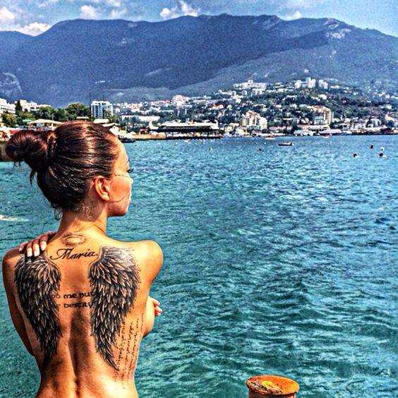 - Если между крыльями находится некая дата, то это тату-память о возможной утрате близкого человека или некая дата, о которой девушка хочет помнить всю жизнь.