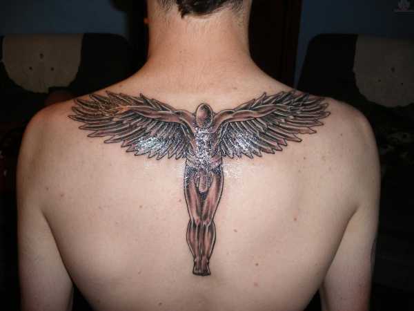 У ангела крылья чаще похожи на лебединые. Рисуется крылатый посланник Бога на большой площади: лопатке, запястье, груди. Предпочитают это изображение мужчины на всей площади спины. Ангел, имеющий крылья, часто представляется без лица или с опущенным лицом.Обладатель такого рисунка стремиться быть свободным и отреченным. Человек хочет защититься от мира, укрыться за широкими крыльями. Если выполнена татуировка ангела со сломанными или обрезанными крыльями – это обозначение переживаний или потери близкого. Те, кто отрекся от веры, также наносят подобный рисунок. Если у ангела имеются рога, обладатель хочет показать свою двойную сущность.
