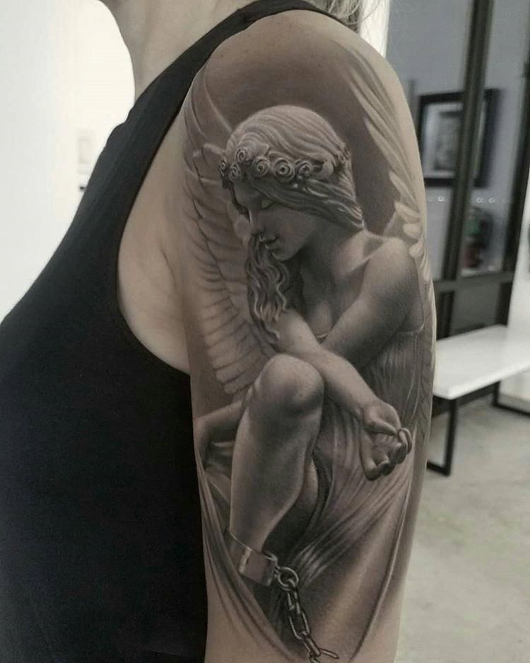 Тату в виде статуи ангела-воина @morozov_tattoo через InstagramЭти виды татуировок ангела-воина действительно интригуют. Их художественный стиль очень реалистичен, но татуировки ангела-хранителя нарисованы так, чтобы они больше походили на статую, чем на человека.