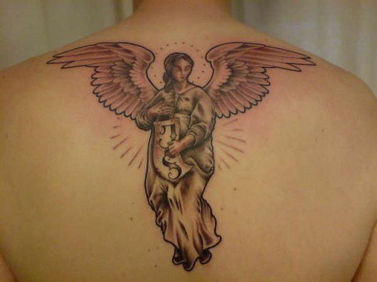 Эти татуировки ангела-хранителя преследуют своей красотой и выглядят совершенно очаровательно на теле. Религиозная символика тяжела в таких татуировках ангелов. Ангел облачен в доспехи с головы до ног, хорошо виден меч и очевидна деталь частично скрытой шестиконечной звезды Давида. Крылья ангела также расправлены и создают иллюзию бдительности, даже когда тело ангела наклонено, как будто он молится.