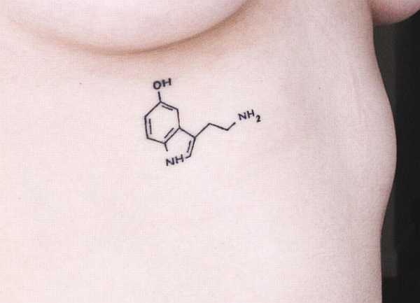 Здесь изображена молекула серотонина (серотонин – “гормон счастья”). Татуировка вполне атеистическая: