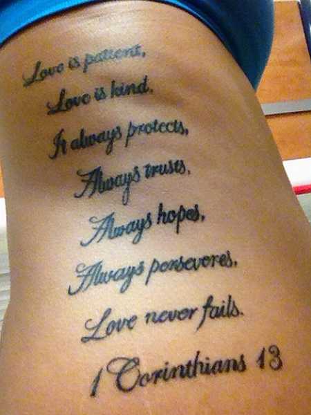 У девушки тоже духовная татуировка. Текст про то что счастливая жизнь строится только путем молитвы, жертвенности, и любви. Дословный текст: “A beautiful life does not just happen, it is built daily by prayer, humilty, sacrifice and love. may that beautiful life be yours always.”