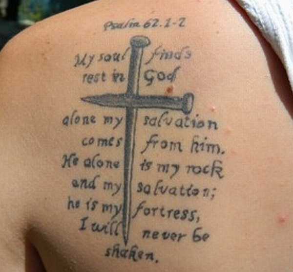 Крест из двух гвоздей, а вокруг текст из Библии (псалом 62;1,2):
