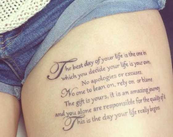 Суть текста на следующей татуировке, что ты сам хозяин своей жизни. Дословно:”The best day of your life is the one on which you decide your life is your own. No apologies or excuses, No one to lean on, rely on, or blame. The gift is yours – it is an amazing journey – and you alone are responsible for the quality of it. This is the day your life really begins”: