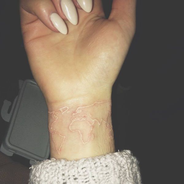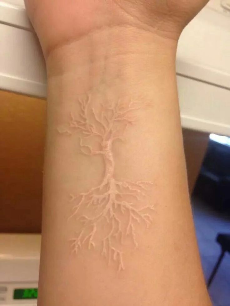 Иногда белая татуировка может настолько потускнеть, что кажется, будто она практически полностью вымылась, в результате чего остается только приподнятый участок кожи нормального цвета.