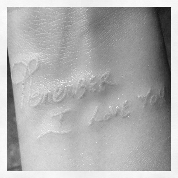Представьте себе татуировку на фотографии выше, но черными чернилами. Черные чернила для такой надписи подойдут намного больше. Черный более основательный чем белый. В белом надпись «stronger» как то не убеждает. В добавок ко всему белый может впитать фиолетовый пигмент от копирки, что собственно произошло в данном случае.