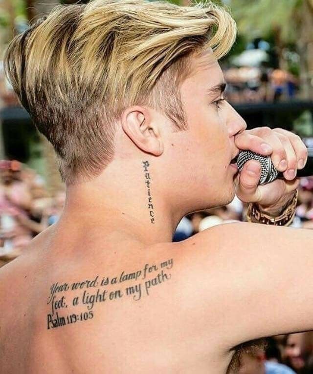 Библейский стих: Псалом 119:105 на его правом плече []25 августа 2013 года у него была еще одна татуировка. Татуировка гласит: «Слово Твое — светильник ноге моей, свет на пути моем», что взято из Псалма 119:105. Это еще одна татуировка, посвященная сильной христианской вере Бибера.